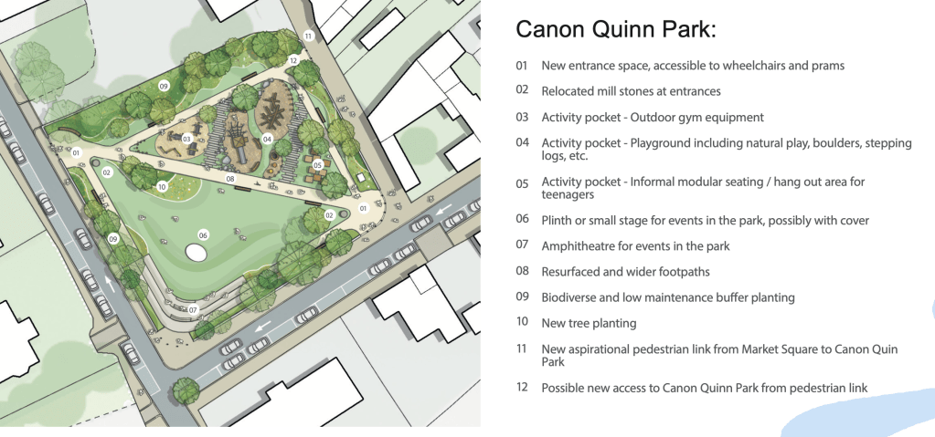 The plan includes an aspirational public river-side park opposite Centra! This future amenity would include an extension of the Gort River Walk on its journey South, which in the future could include pedestrian linkages across to church St/Tubber road. As well as giving a fantastic amenity to residents, this will make the town and additional attraction for visitors. There is also significant improvements to Cannon Quinn park, with a lot of input from students at Gort Community School, including activity pockets, an amphitheatre for events in the park and pedestrian linkage to the square. The Amphitheatre will be supportive of events like ‘Poetry in the Park’ or local, visiting artists/musicians, providing a platform for people and again draw more people into the town.